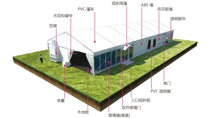 4. 篷房規格主要有:600g/m2 、650g/m2 、750g/m2 、850g/m2 、900g/m2 等;