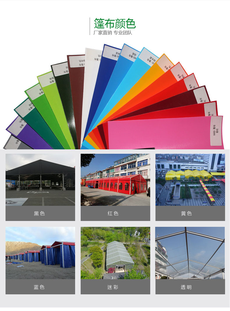 大篷房倉儲系列的跨度尺寸有10m,12m,15m,20m,21m,25m,30m,35m,40m,45m,50m,倉儲系列的結構采用單元組合式設計,長度可按5米間距增長或減小,支架材料采用高強度氧化鋁合金(材質6061/T6),篷布采用阻燃的雙面PVC合成纖維布,阻燃標準符合歐洲DIN4102 B1、M2標準。
